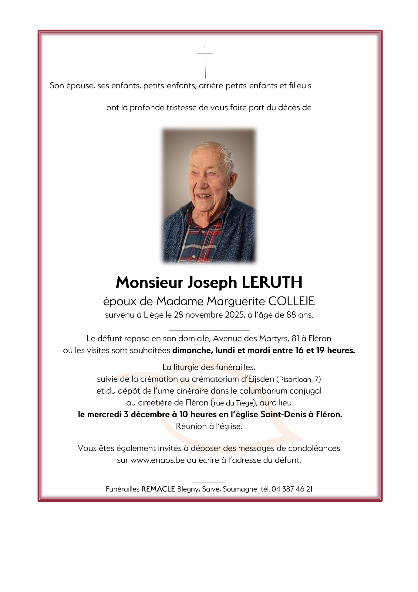 Décédé à Liège (4000, Belgique) le vendredi 28 novembre 2025 à l'âge de 88 ans