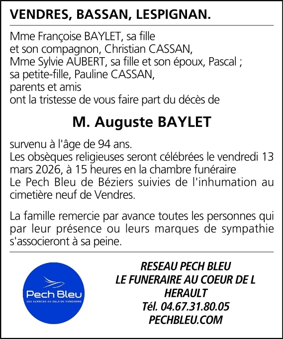 Décédé à Vendres (34350, France) le lundi 9 mars 2026 à l'âge de 94 ans