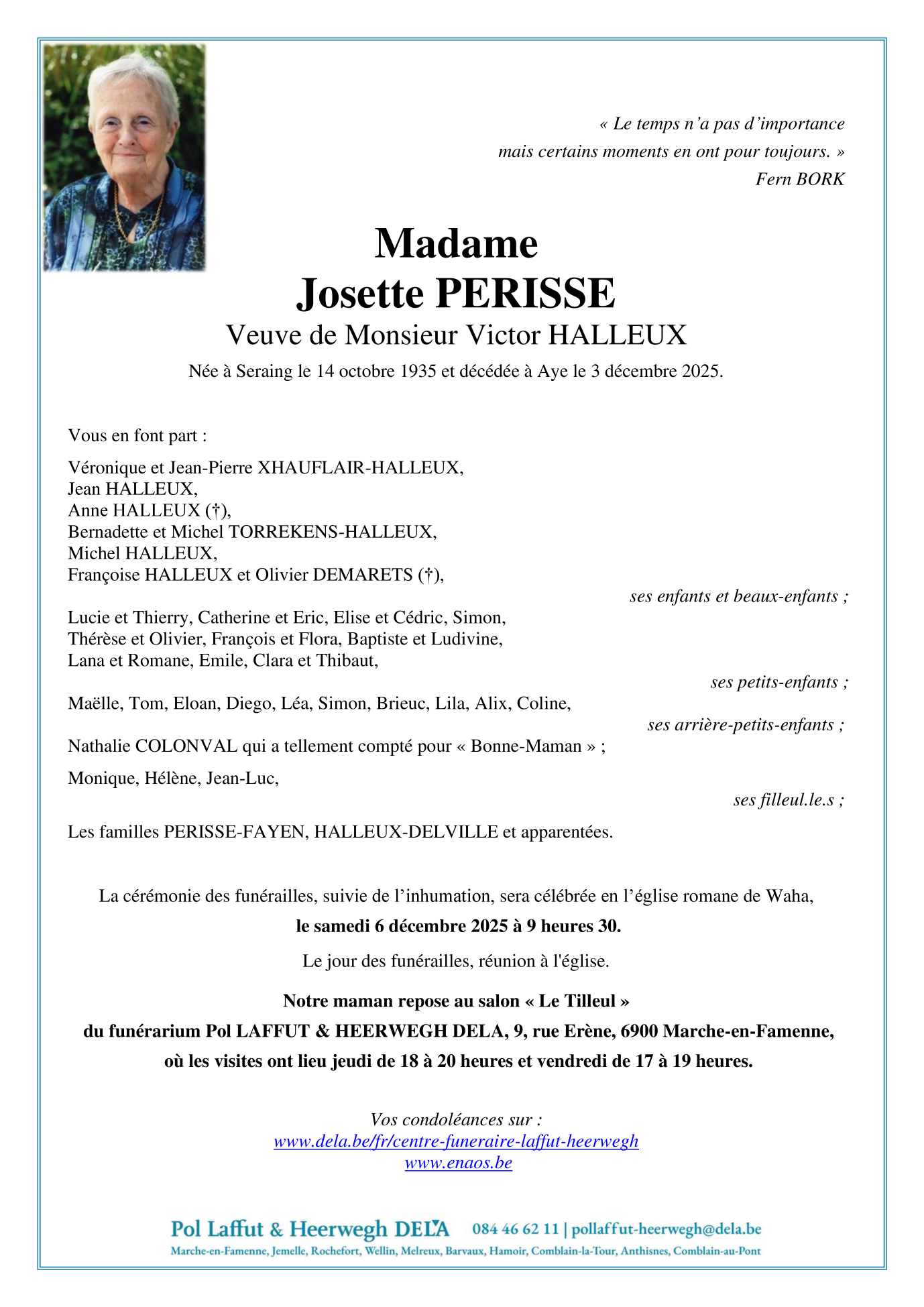 Fallecida en Aye (6900, Bélgica) el miércoles, 3 de diciembre de 2025 a la edad de 90 años