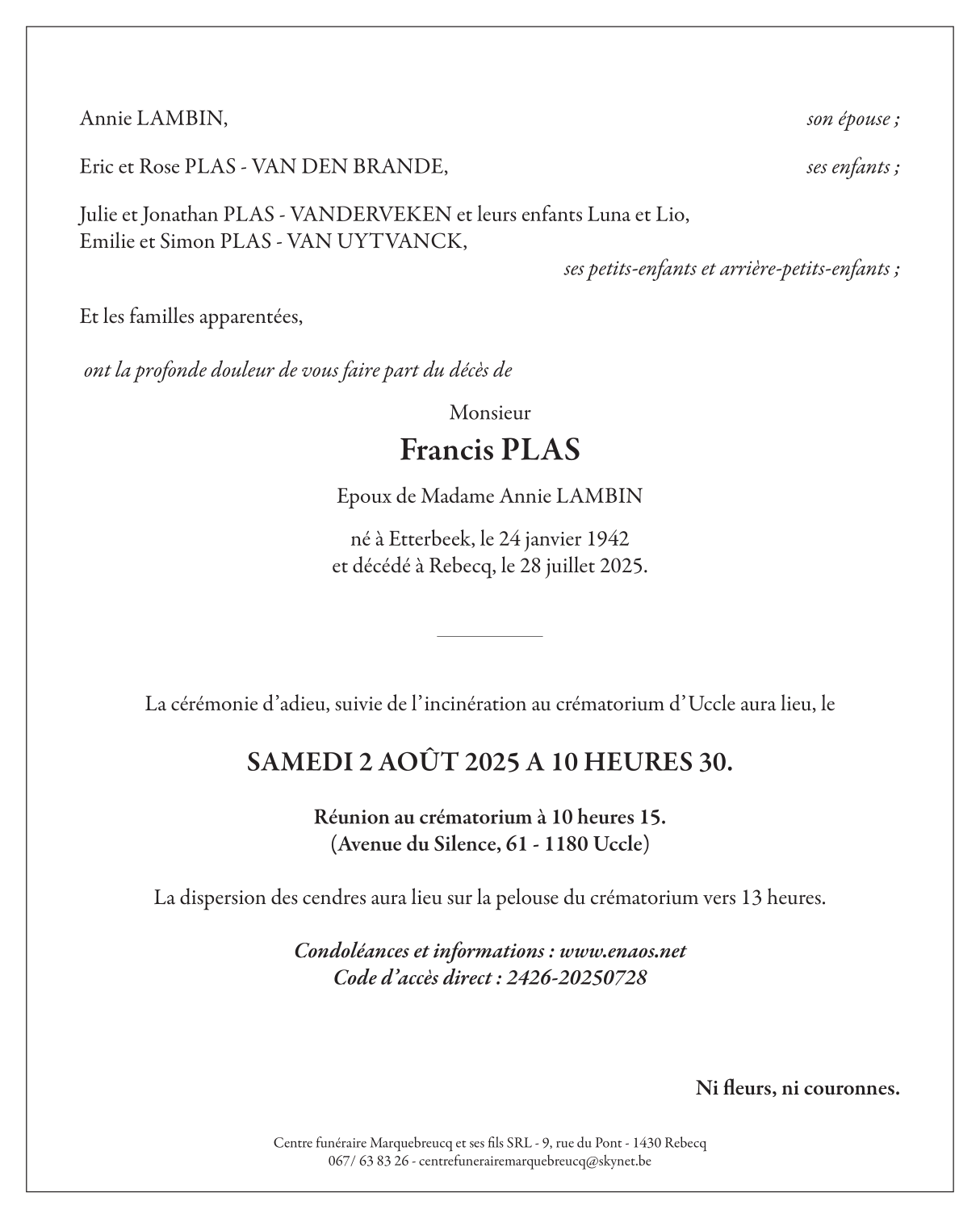 Fallecido en Rebecq (1430, Bélgica) el lunes, 28 de julio de 2025 a la edad de 83 años