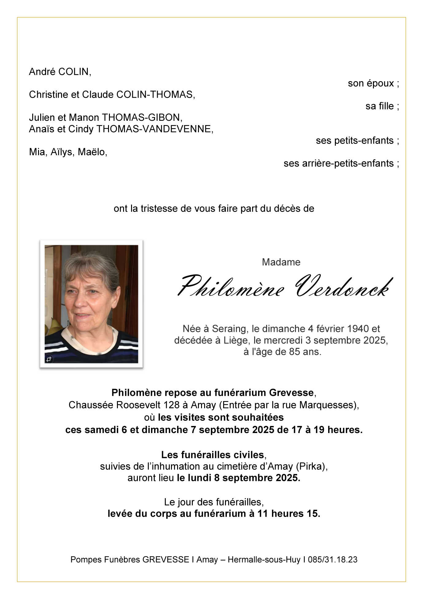 Décédée à Liège (4000, Belgique) le mercredi 3 septembre 2025 à l'âge de 85 ans