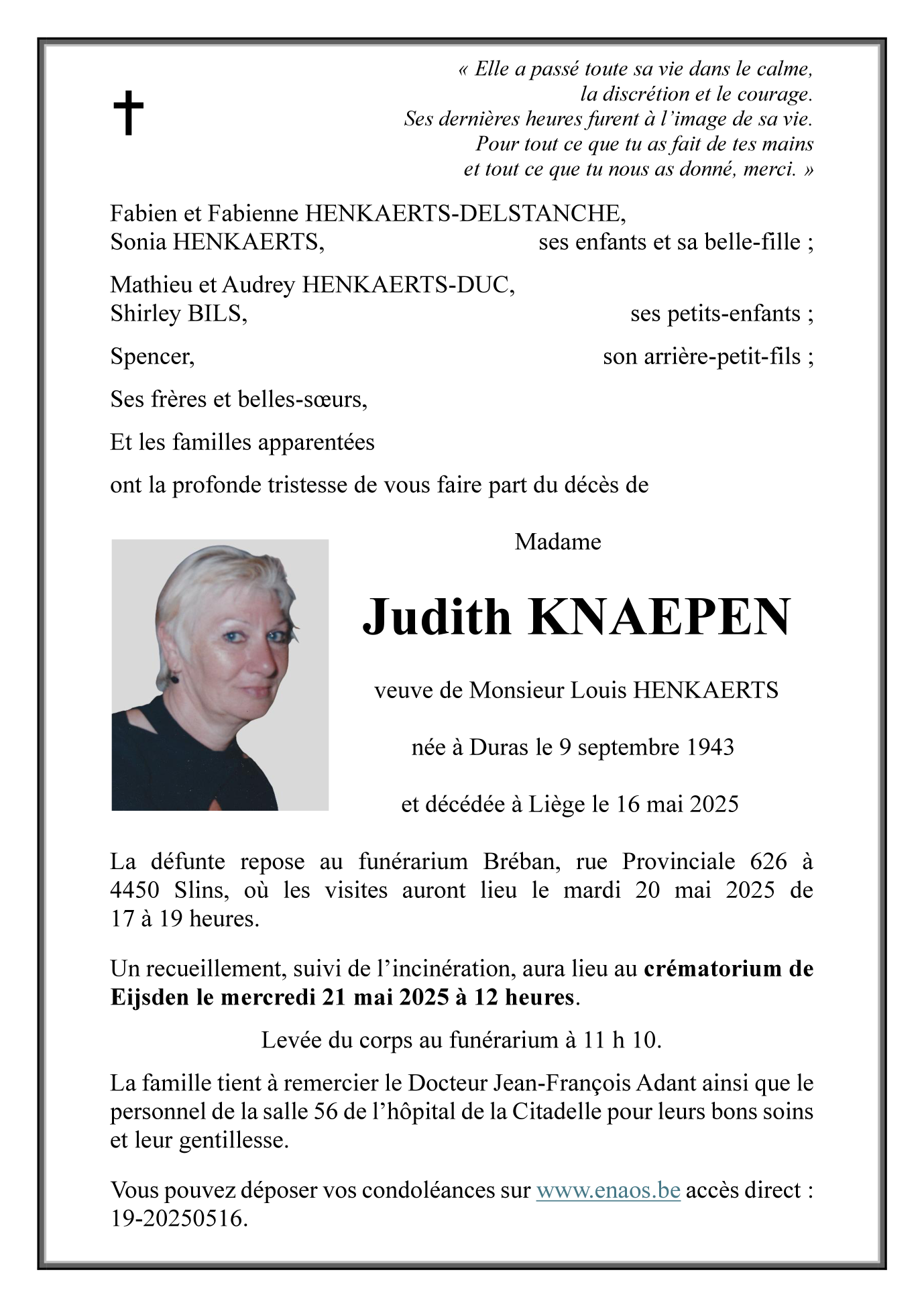 Madame Judith KNAEPEN veuve de Louis HENKAERTS