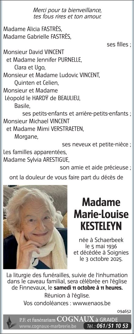 Fallecida en Soignies (7060, Bélgica) el martes, 7 de octubre de 2025 a la edad de 89 años
