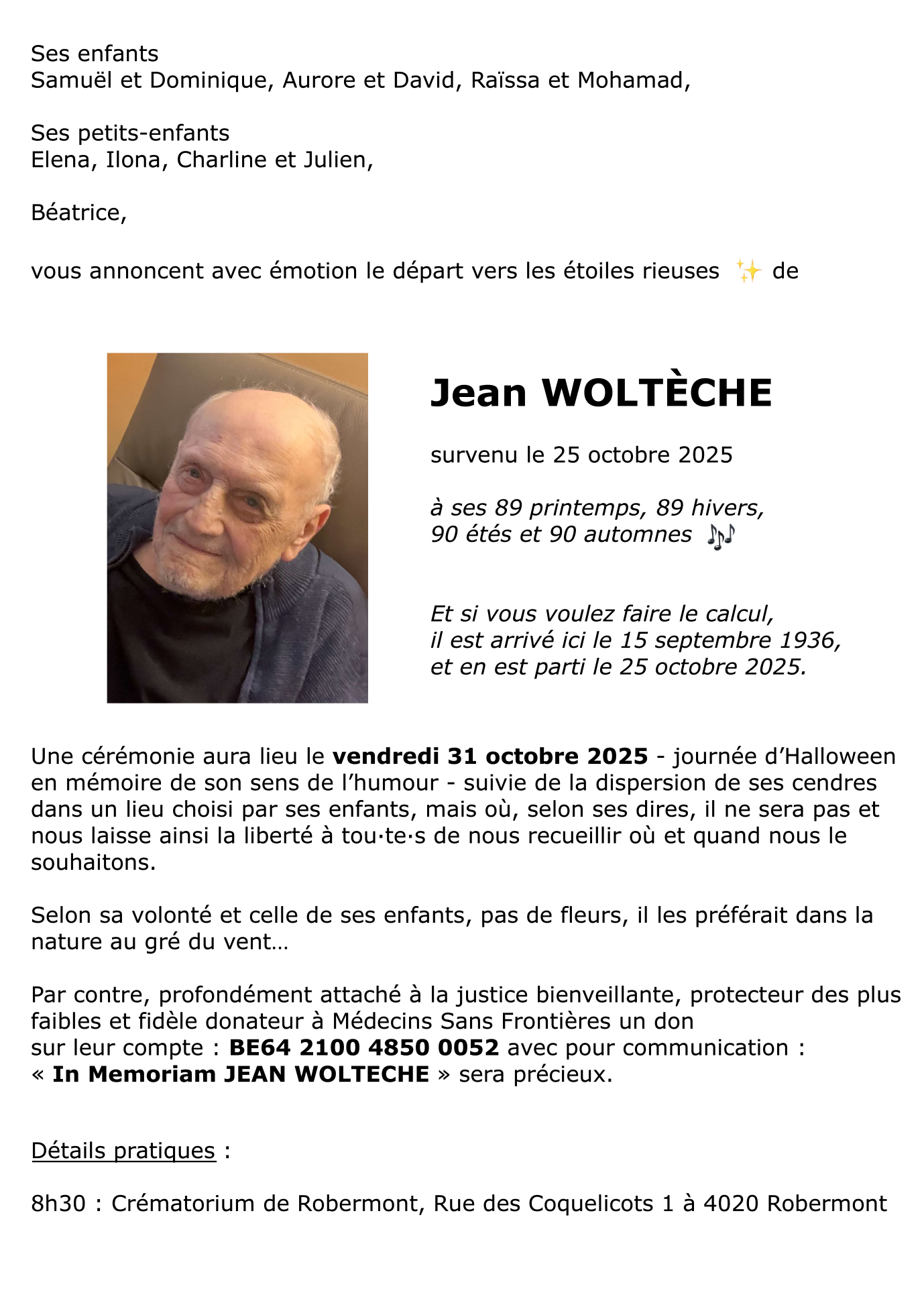Fallecido en Sprimont (4140, Bélgica) el sábado, 25 de octubre de 2025 a la edad de 89 años