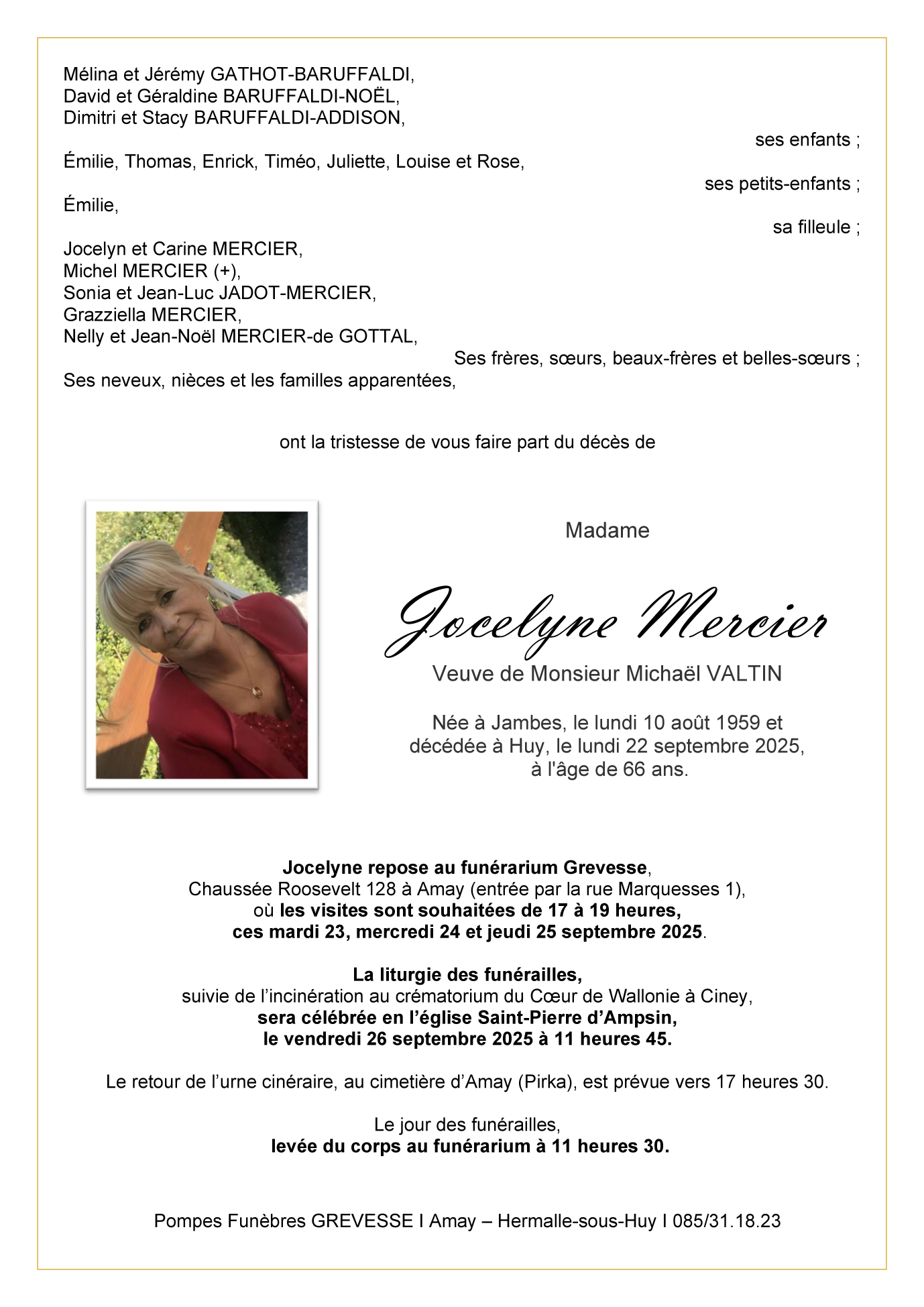 Fallecida en Huy (4500, Bélgica) el lunes, 22 de septiembre de 2025 a la edad de 66 años