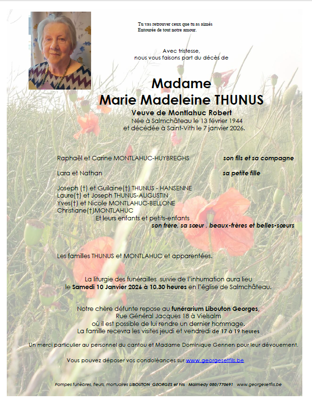 Fallecida en Saint-Vith (4780, Bélgica) el miércoles, 7 de enero de 2026 a la edad de 81 años