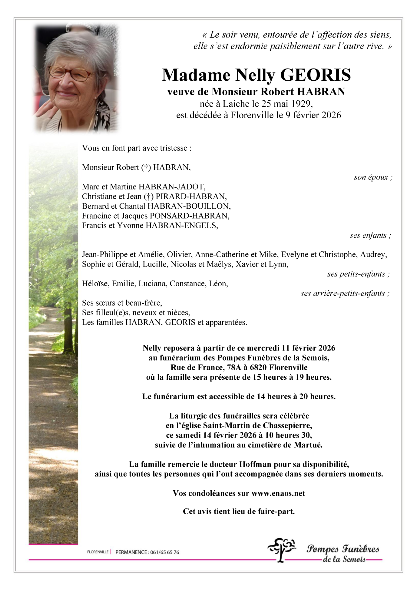 Fallecida en Florenville (6820, Bélgica) el lunes, 9 de febrero de 2026 a la edad de 96 años