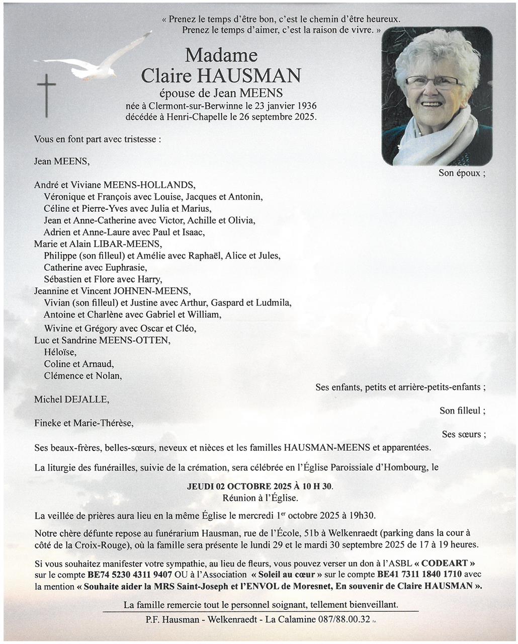 Fallecida en Henri-Chapelle (4841, Bélgica) el viernes, 26 de septiembre de 2025 a la edad de 89 años