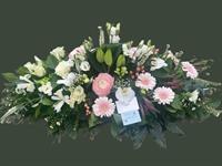 Petit montage composé d'un assortiment de fleurs blanches, rose, gerberas, oeillets.
