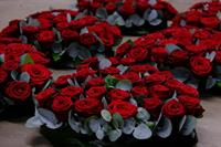 Montage floral de grande taille composé de roses, gerberas et glaïeuls.