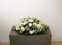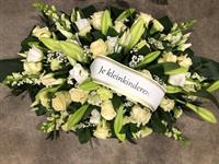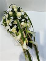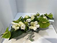 Photo non contractuelle | TCG4 – Klassiek rouwbloemstuk Rouwbloemstuk met rozen, lelies, lysianthus, leeuwenbek, groene anjers, gypsophila. Lengst: 60 à 70 cm.