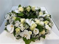 Photo non contractuelle | TCG2 – Krans / Urnekrans Krans met orchideeën, rozen, lysianthus, gypsophila, salal, eucalyptus.