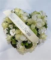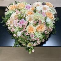 Photo non contractuelle | AVW02 - Hart met bloemen in pastelkleuren Hart in pastelkleuren 33 cm. met rouwlint.