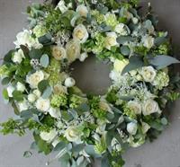 Photo non contractuelle | AVW05 - Rouwkrans met witte bloemen en groen Rouwkrans met witte bloemen en groen.
