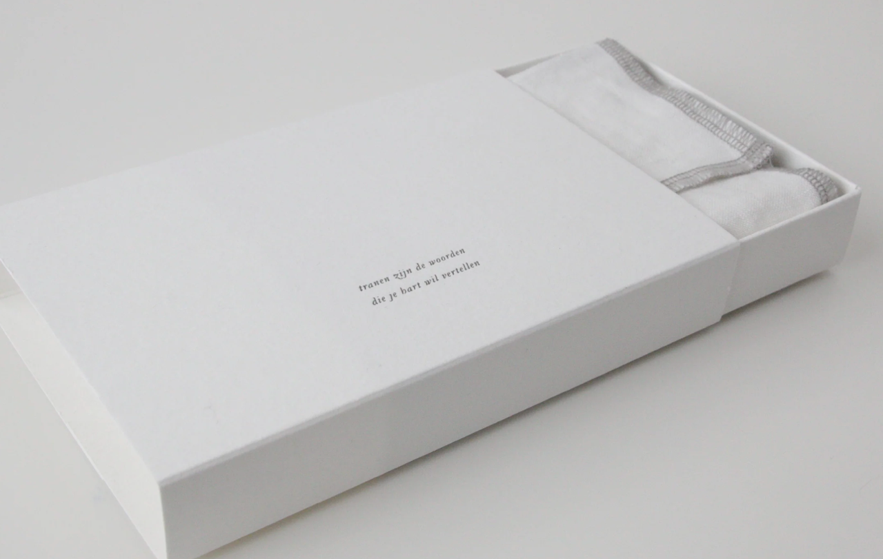 | zakdoekdoosje ’tranen zijn de woorden die je hart wil vertellen’ Water vloeit, water verzacht. Deze zakdoeken vangen de tranen liefdevol op. Vervaardigd uit aangenaam linnen, met de hand omrand. Deze mooie handgemaakte zakdoek zit verpakt in een schuifdoosje met de tekst "tranen zijn de woorden die je hart wil vertellen"