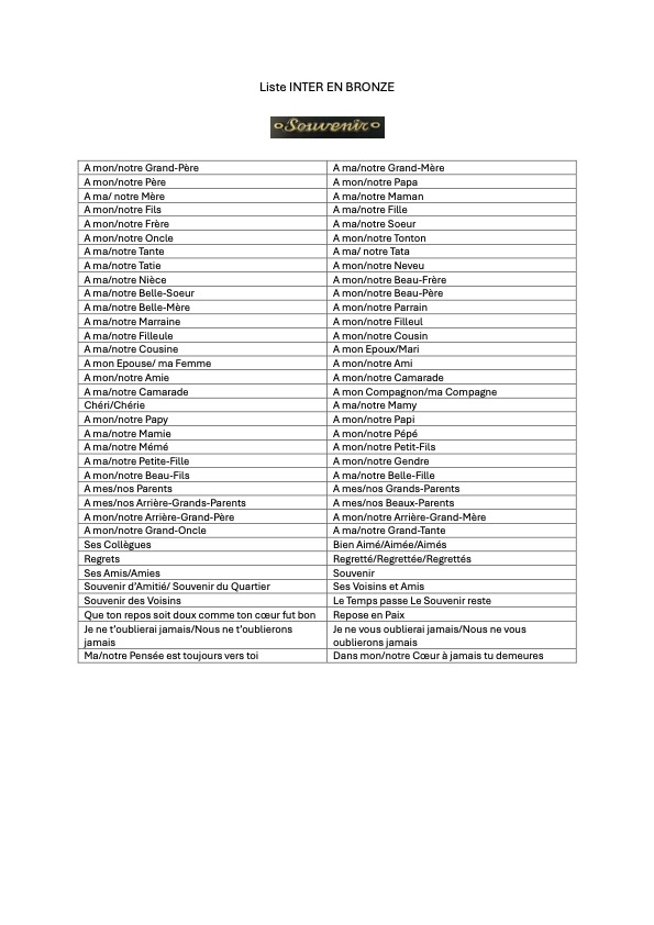 | Inter bronze Liste des Inters en bronze disponibles à rajouter sur la plaque funéraire de votre choix.