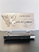 | Plaque altuglass et inox papillon Plaque altuglass et inox papillon sur socle granit ( 18,50x13,50) avec texte.