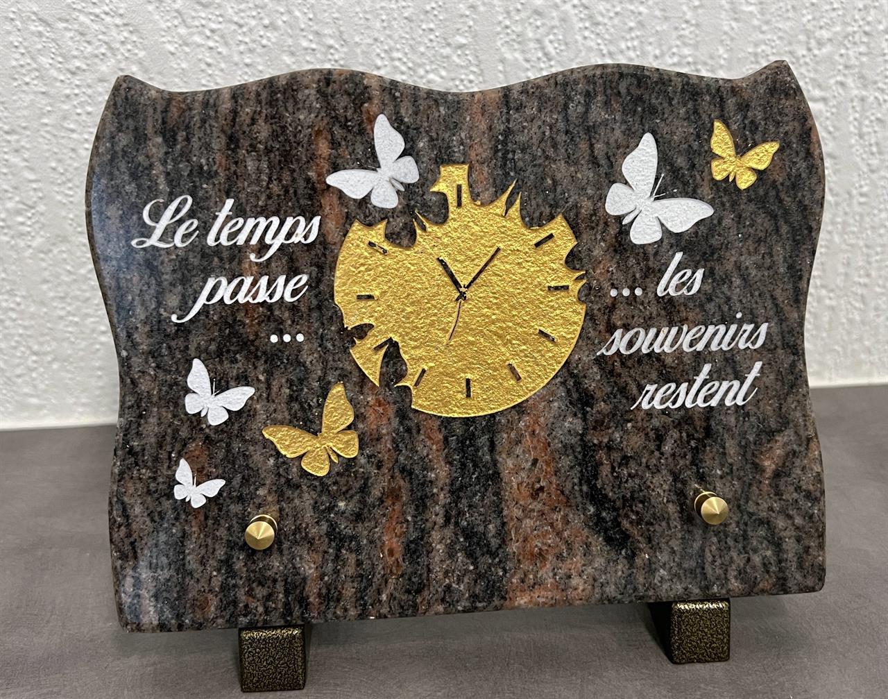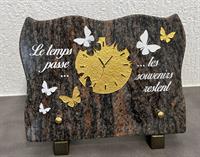 | Plaque souvenir granit Plaque souvenir granit 20X17cm sur pieds avec un motif de pendule dorée, texte et papillons comprenant 1 inscription (inter en bronze). Merci de nous appeler au 04 78 29 07 11 pour nous préciser le texte souhaité. Attention : commande au plus tard le vendredi jusqu'à 18h pour les obsèques qui ont lieu le lundi.