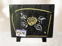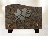 | Plaque souvenir granit Plaque souvenir en granit sur pieds avec un motif d'une rose en inox, dim : 16cmde large X 12cm de haut,, comprenant 1 inscription (inter en bronze). Merci de nous appeler au 04 78 29 07 11 pour nous préciser le texte souhaité. Attention : commande au plus tard le vendredi jusqu'à 18h pour les obsèques qui ont lieu le lundi.