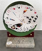 | Plaque souvenir en granit et altuglas Plaque souvenir avec un socle en granit et motif de jeu de cartes en altuglas comprenant 1 inscription (inter en bronze). Dim : 19cm de large par 21cm de haut.