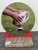 | Plaque souvenir rugby Plaque souvenir avec un socle en granit et motif de ballon de rugby en altuglas comprenant 1 inscription (inter en bronze). Dim : 19cm de large par 21cm de haut.
