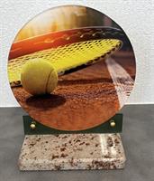 | Plaque souvenir tennis Plaque souvenir avec un socle en granit et motif de tennis en altuglas comprenant 1 inscription (inter en bronze). Dim : 19cm de large par 21cm de haut.