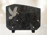| Plaque souvenir granit Plaque souvenir en granit sur pieds avec un motif d'une colombe en inox, dim : 21cmde large X 16,5cm de haut, comprenant 1 inscription (inter en bronze). Merci de nous appeler au 04 78 29 07 11 pour nous préciser le texte souhaité. Attention : commande au plus tard le vendredi jusqu'à 18h pour les obsèques qui ont lieu le lundi.