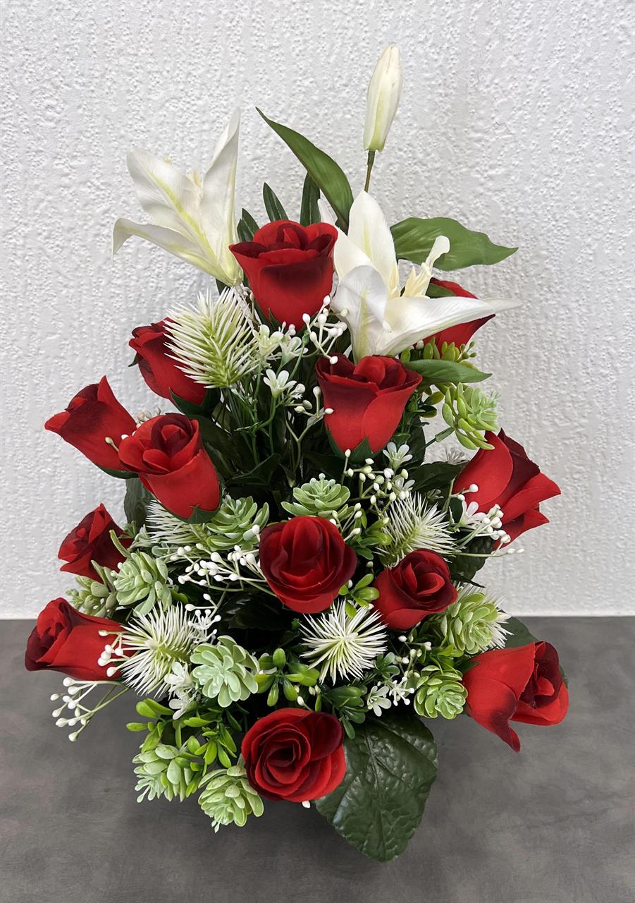 | Composition de fleurs tergal Composition de fleurs tergal dans un pot lesté avec des roses rouges et roses.