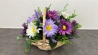 | Composition de fleurs tergal Composition de fleurs tergal dans un panier lesté en osier. Gerbéras.