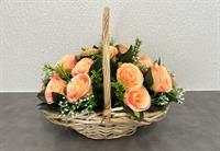 | Composition de fleur tergal Composition de fleurs tergal dans un panier lesté en osier avec des roses.