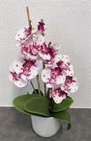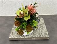 | Composition de fleurs tergal Orchidée en tergal dans un pot en résine posé sur des galets et un carreau en grès.