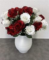 | Cœur de roses Composition en forme de cœur avec des fleurs tergal dans pot bien lesté. Roses rouges, blanches et bordeaux, gypsophile.
