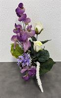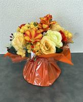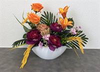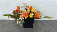 | Composition de fleurs tergal Composition de fleurs tergal dans un pot lesté avec des roses et orchidées.