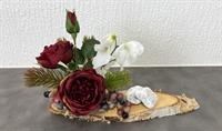 | Composition de fleurs tergal Composition de fleurs tergal sur un rondin de bois lesté avec des raisins, galets et roses.