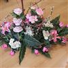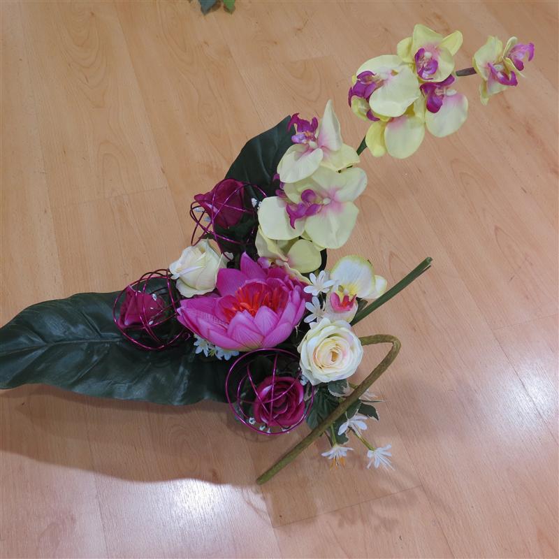 Composition avec sa mousse en forme de coussin. Composition lestée. Composition en forme montante. Couleur dominante rose.