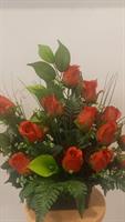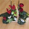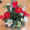 Coupe de fleurs variées, de couleur dominante rouge. Composition lestée.