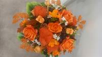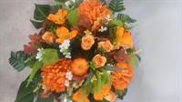 Composition de fleurs lestée. Dominante des couleurs, saumonée et jaune.