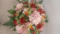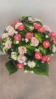 Gerbe de fleurs avec un joli pouvoir couvrant. Composition lestée. Fleurs couleur dominante rose et jaune pâle.