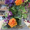 Très joli travail sur cette composition, qui est posée sur une belle ardoise. Composition avec une belle assise. Composition montante avec des fleurs de couleur dominante dans les orangées et mauves. Possibilités d'y ajouter des "inters" avec des textes .