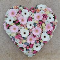 Photo non contractuelle | 🌸Cœur Fleuri « Tendresse Infinie » Ce cœur floral, composé de germinis roses et blancs, de roses pastel et de petites fleurs, symbolise l'amour éternel, la pureté des souvenirs et la tendresse des liens partagés.