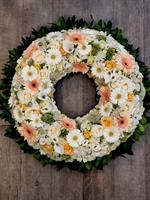 Photo non contractuelle | 🌸Couronne Florale « Sérénité Pastel » Cette couronne florale, composée de roses blanches et pêche, de germinis pastel et de callas, symbolise la pureté et l’apaisement, offrant un hommage élégant et serein, souligné par un feuillage vert.