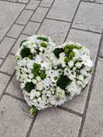 Photo non contractuelle | 🌸Cœur Fleuri « Sérénité Blanche » Ce cœur floral, composé de roses blanches, de germinis et de verdure, symbolise la pureté, l'amour éternel et la paix, offrant un hommage sobre et respectueux.