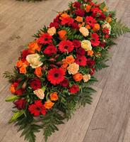 Photo non contractuelle | 🌸Raquette Florale « Flamme du Souvenir » Cette raquette florale, composée de roses rouges et orangées, de germinis et de carnations pastel, symbolise l’intensité des émotions et rend un hommage vibrant et élégant.