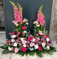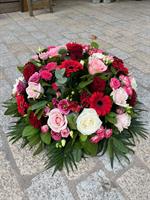 Photo non contractuelle | 🌸Composition Florale pour Obsèques « Tendresse Éternelle » Cette composition élégante, composée de roses roses et rouges, de germinis éclatants et de feuillage raffiné, symbolise l'amour éternel, la tendresse et le respect.