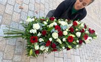 Photo non contractuelle | 🌸Devant de Cercueil « Hommage Solennel » Cette composition élégante en rouge et blanc, mêlant roses rouges, roses blanches, lys et germinis, rend hommage avec amour et dignité, créant un contraste noble et intemporel.