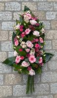 Photo non contractuelle | 🌸Devant de Cercueil « Douceur Éternelle » Ce devant de cercueil, composé de roses pastel, germinis roses et fleurs de saison, symbolise la tendresse et la sérénité, offrant un hommage élégant et respectueux.