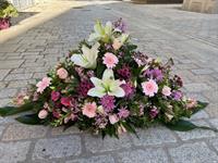 Photo non contractuelle | 🌸Dessus de Cercueil « Éternelle Douceur » Ce dessus de cercueil associe des fleurs roses et blanches, telles que des lys blancs, des germinis roses et des roses pastel, symbolisant tendresse et apaisement dans un hommage gracieux et sobre.