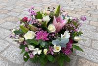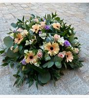 Photo non contractuelle | 🌸Coussin de Fleurs « Sérénité Pastel » Ce coussin rond en tons pastel, composé de germinis crème, roses pastel, freesias blancs et lisianthus mauves, symbolise l’apaisement et la tendresse, offrant un hommage délicat et élégant.