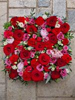 Photo non contractuelle | 🌸Coussin Carré « Éclat Passion » Ce coussin carré, avec des roses rouges, des œillets écarlates et des fleurs roses, rend un hommage vibrant symbolisant l'amour éternel, le respect et la mémoire.