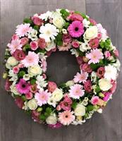 Photo non contractuelle | 🌸Couronne Florale « Éclat de Tendresse » Cette couronne florale, mêlant roses pastel, germinis rosés et fleurs de saison, symbolise la tendresse éternelle et l’apaisement, offrant un hommage doux et raffiné.